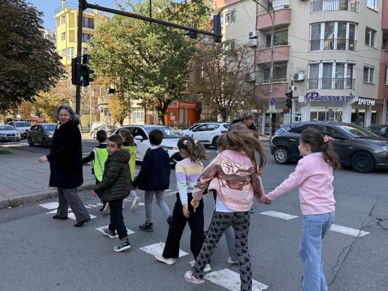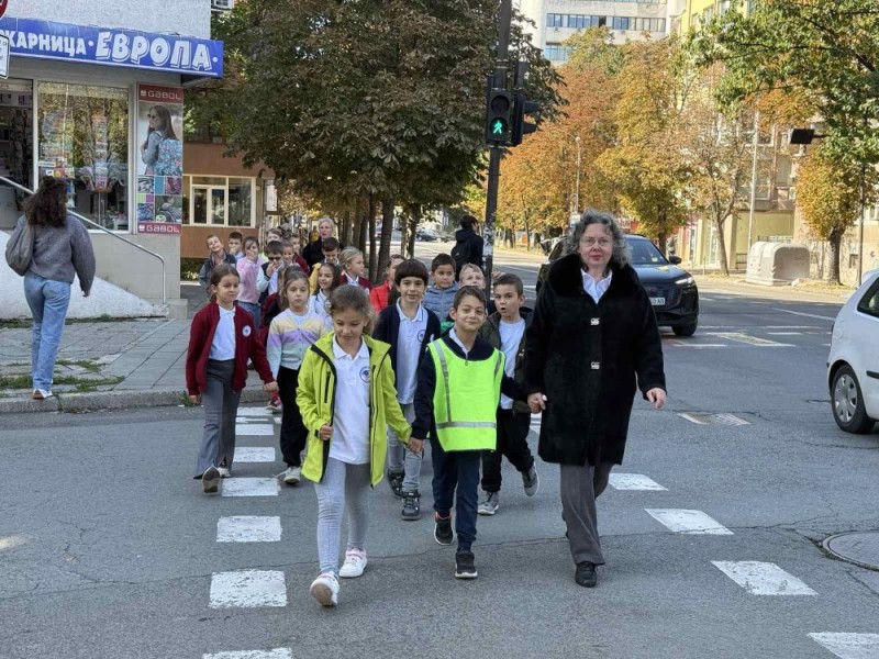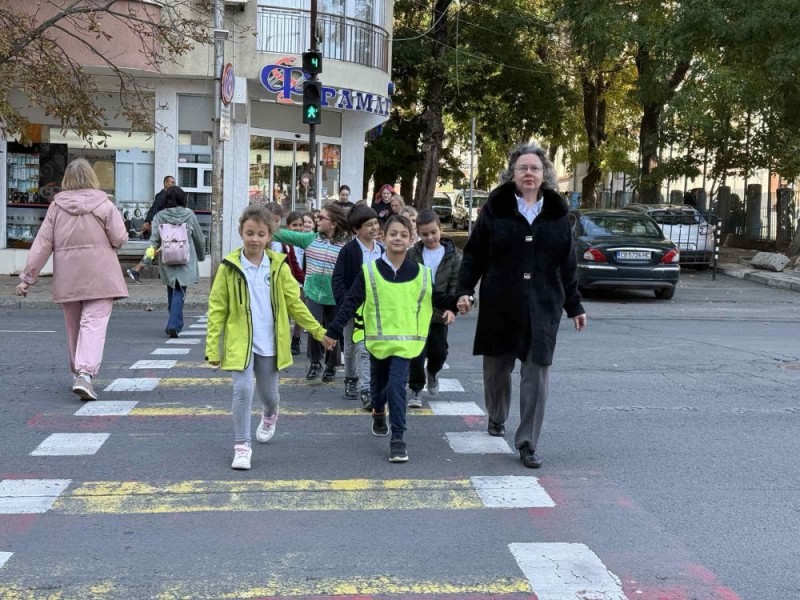 Учениците облякоха сигнални жилетки и демонстрираха правилно преминаване през пешеходна пътека, спиране на светофара и придвижване по тротоара.