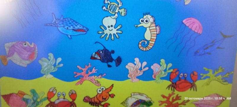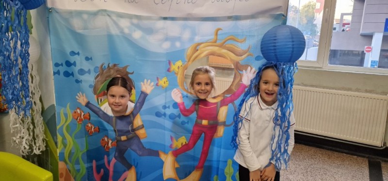 Фоайето на училището се превърна във впечатляващ подводен свят – с вълни, риби, медузи и пъстри морски картини. С помощта на учителите от ЦОУД, учениците украсиха целия първи етаж като истинско морско дъно и създадоха кът за снимки, който внесе много настроение и усмивки. Снимките пред морския декор отново ни показаха, че любовта към природата започва от училище – с познание, грижа и добро отношение.