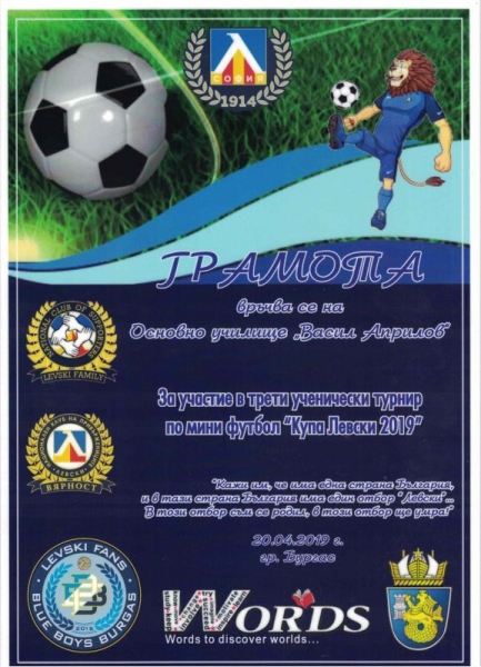 ВТОРО МЯСТО за отборът по футбол на нашето училище в Трети ежегоден ученически футболен турнир “КУПА ЛЕВСКИ 2019”. Основната цел на турнира е да популяризира футболната игра, като се повишат интереса и спортната култура на децата. ПОЗДРАВЛЕНИЯ за малките футболисти!
