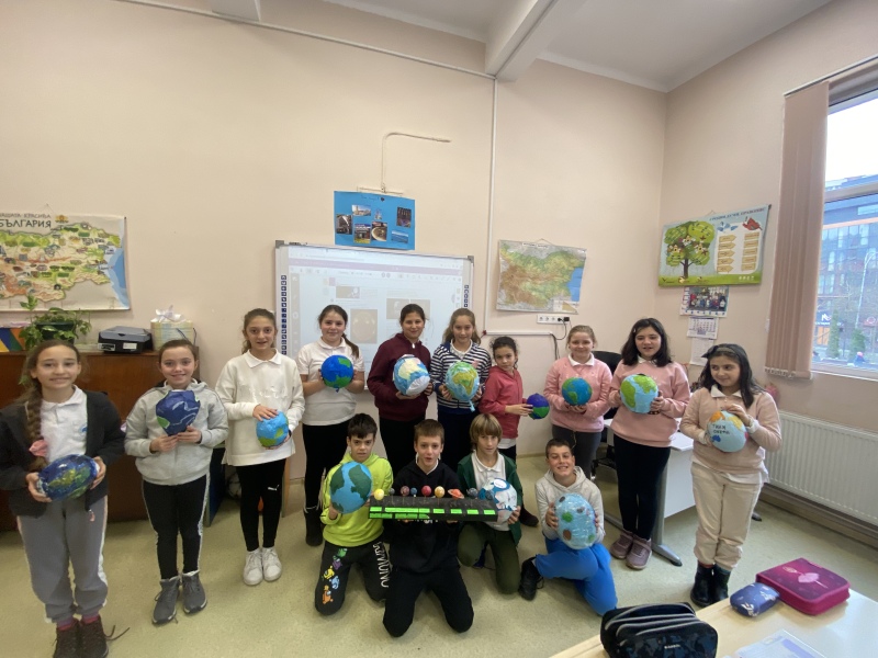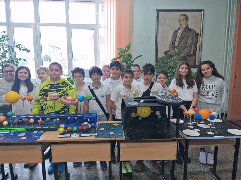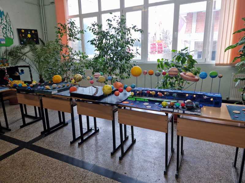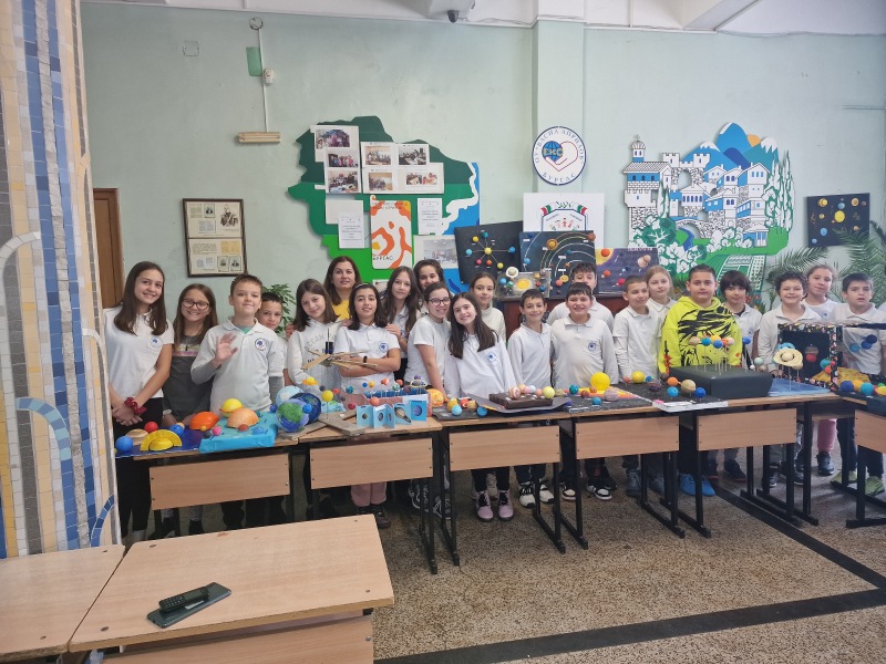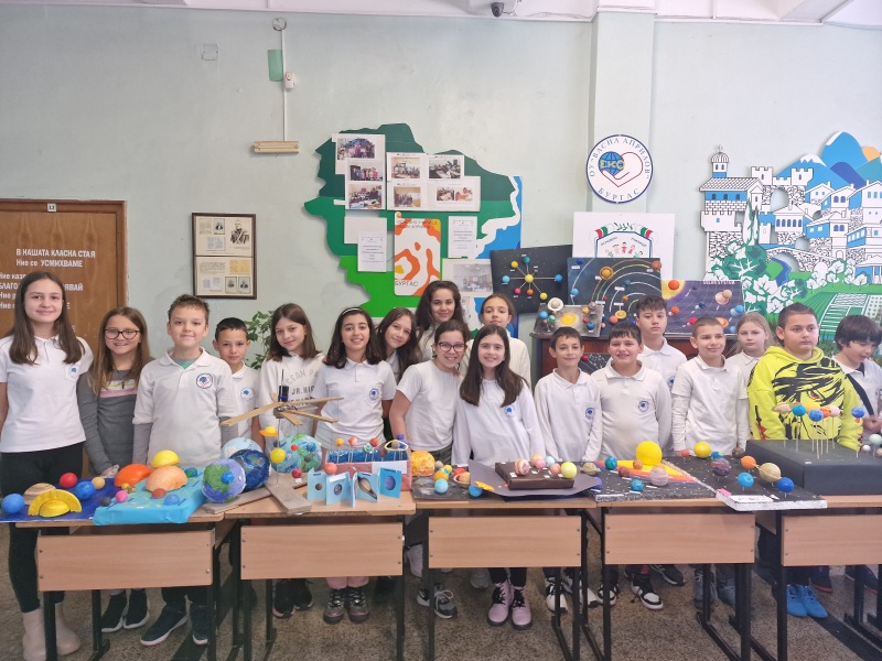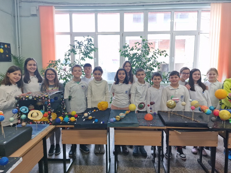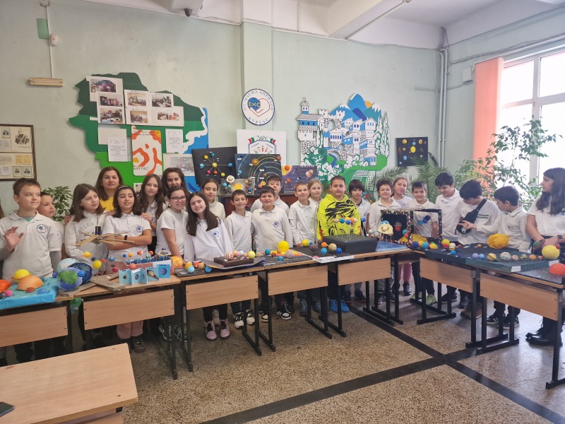 Учениците от четвъртите класове изучиха раздел “Планетата Земя” по “Човекът и природата”, уловиха красотата на Слънчевата система, превърнаха се в архитекти  на интересни и цветни  модели на планетите и преобразиха фоайето на училището в истински планетариум.