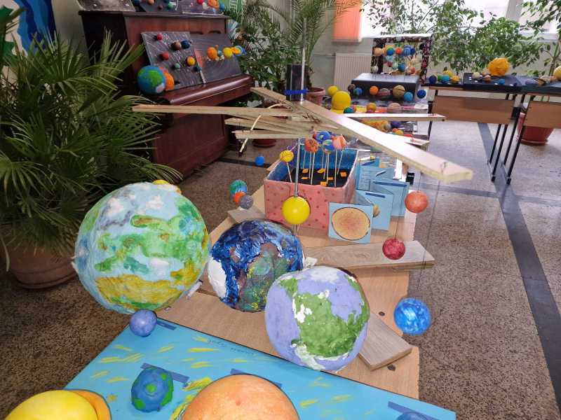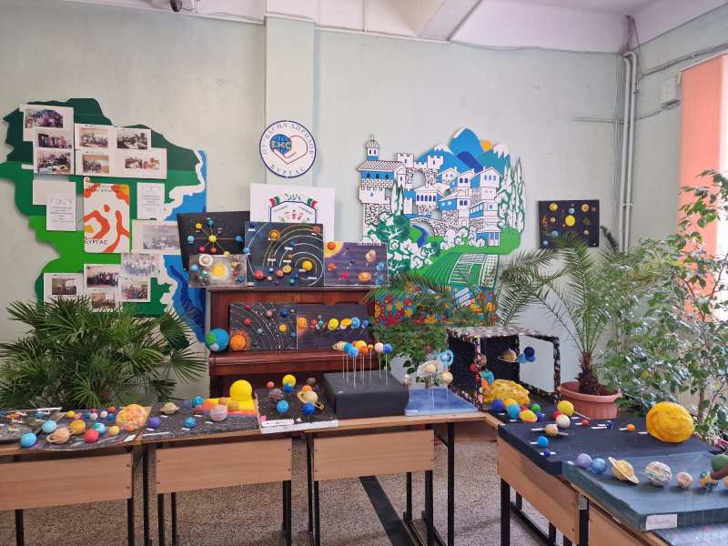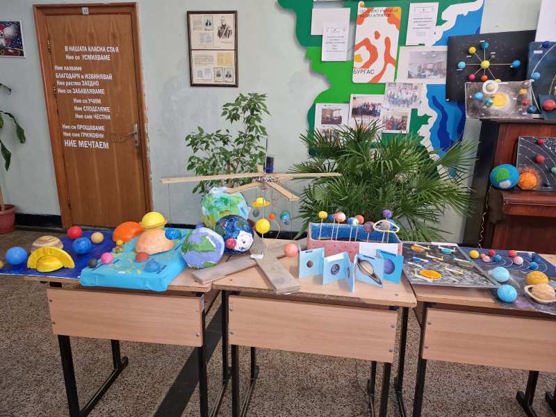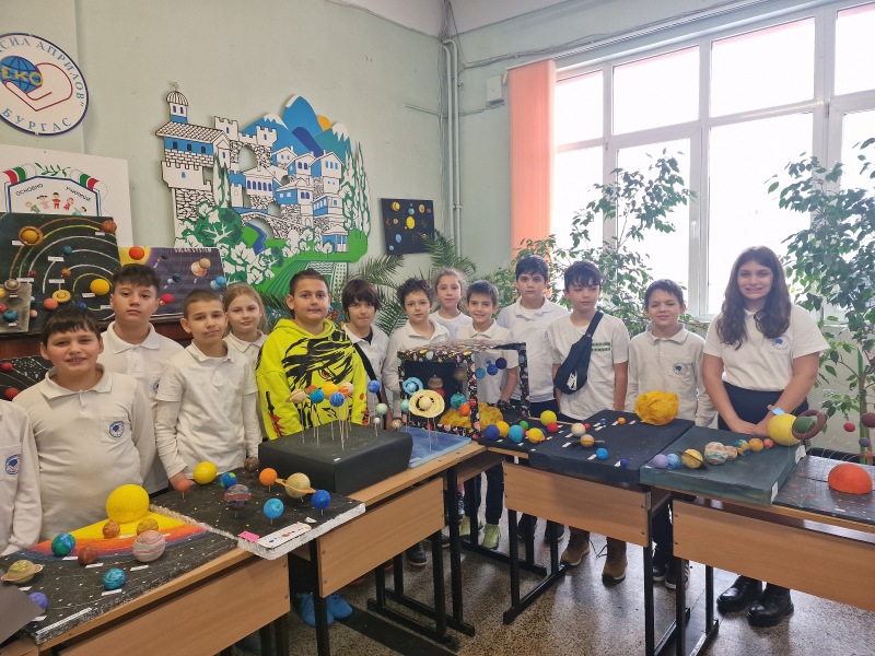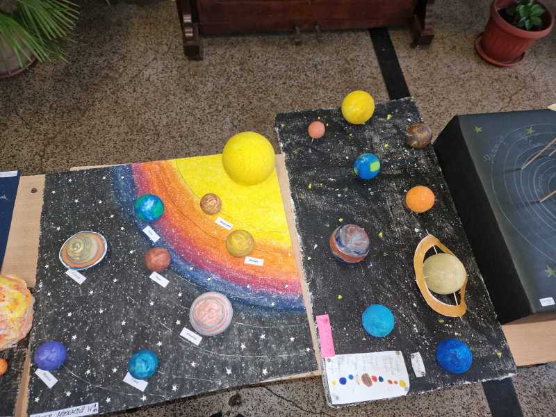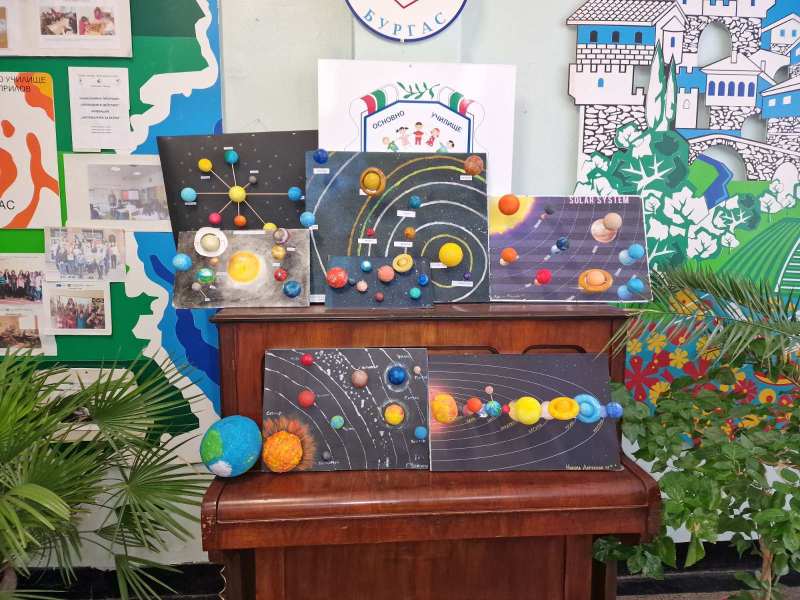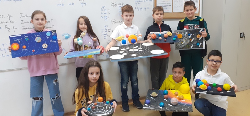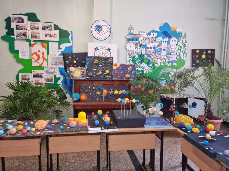 Учениците от четвъртите класове изучиха раздел “Планетата Земя” по “Човекът и природата”, уловиха красотата на Слънчевата система, превърнаха се в архитекти  на интересни и цветни  модели на планетите и преобразиха фоайето на училището в истински планетариум.