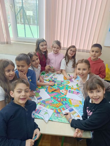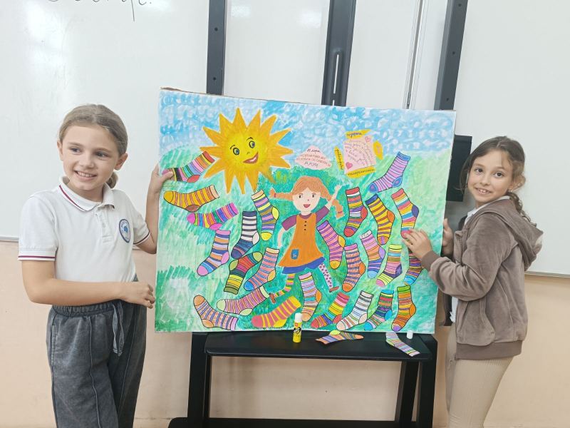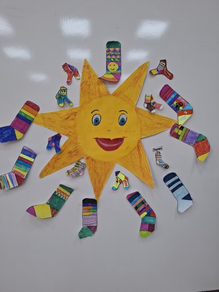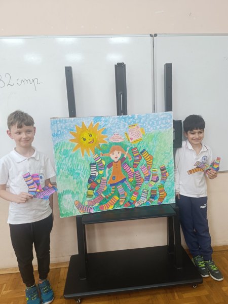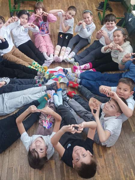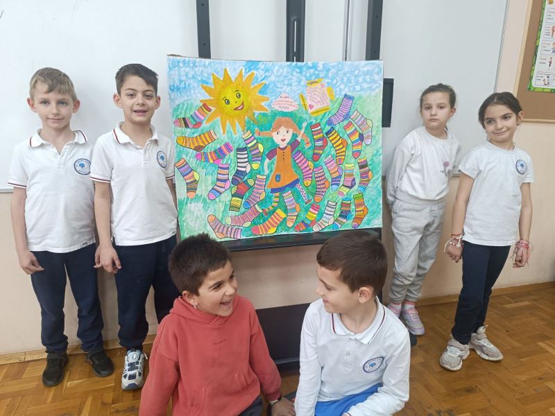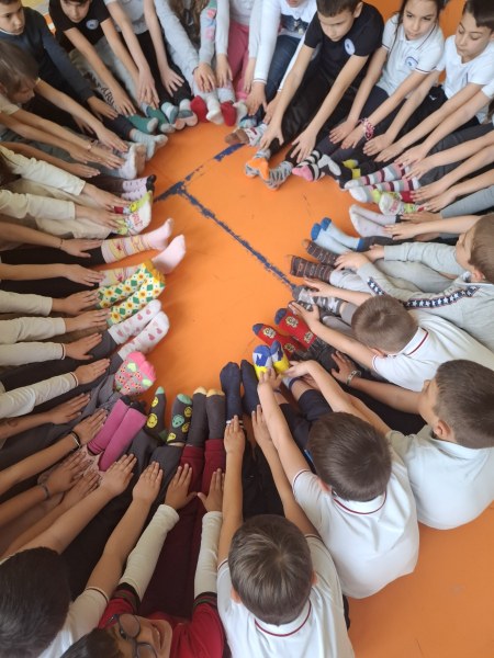 Всички първи класове се обединиха около символа на деня – шарените чорапки, които носят послание за приемане, различие и красотата да бъдеш точно такъв, какъвто си. Децата се появиха в училище с най-ярките и забавни чорапи, които имаха, а в класните стаи превърнаха този символ в творческо приключение. Всички оцветиха свои собствени „шарени чорапки“ на хартия, като вложиха много въображение, настроение и сърце.